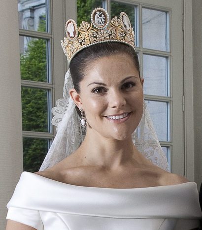 Na głowie Auf dem Haupt der 32-jährigen Victoria befand sich ein Diadem aus Gold und Perlen gefertigt - welchen ihre Mutter Königin Silvia vor 34 Jahren 1976 während ihrer Hochzeit trug.