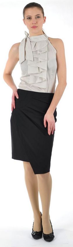 Das präsentierte Model trägt eine Bluse mit Rüsche von DOTS, einen Rock von DOTS und Pumps von Blink Tilda>.