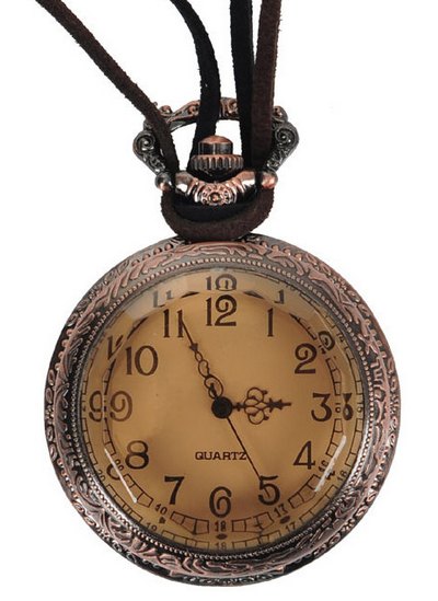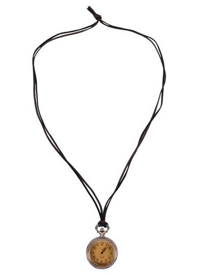 Diese Halskette, von der hier die Rede ist, wurde aus einem Leder Riemen und einer Uhr gefertigt. Die Uhr ist zum öffnen, aus Metall. Deren Seiten sind bemerkenswert verziert.