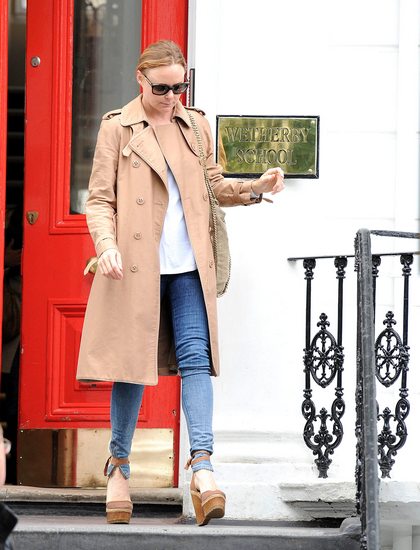 Diese Idee gefällt mir sehr, deshalb habe ich mich entschieden einen näheren Blick auf den Stil bekannter Designer zu werfen. Als erstes Stella McCartney. Vorgestern sah man sie mit ihrem Sohn auf dem Weg zur Schule. Sie hatte eine weiße Bluse an, einen tollen Trench in Sandfarbe, blaue Jeans und sehr hohe Plateauschuhe an.
