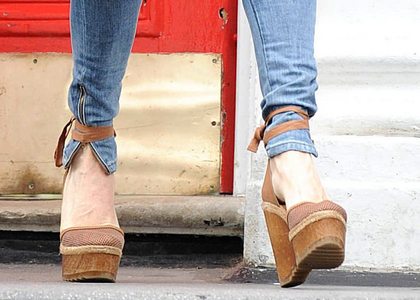 Eigentlich nichts außergewöhnliches, aber schauen Sie sich die Tragevariante der Schuhe an. Die Sandaletten sind am Hosenbein gebunden.