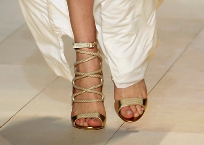Wir haben in unserem vorherigen Beitrag über Verbindungen geschrieben, bei denen das Endprodukt nicht gelungen aussieht. Hier handelte es sich um die Sneaker See by Cloe, deren Schuhspitze ist lackiert, bei der der Schaft aus Jean übergeht und das noch mit Schnürung. Tommy Hilfiger verbindet etwas feiner den Stil goldener Sandalen mit langem Stöckelabsatz und avantgardistischer Schnürung.