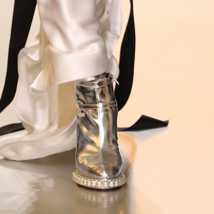 Ein Element, was ganz sicher in die Modegeschichte geht, sind die silbernen Stiefeletten und Sandalen, deren Laufsohle mit Perlen bestückt wurde.