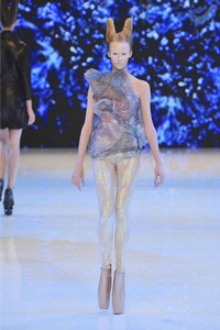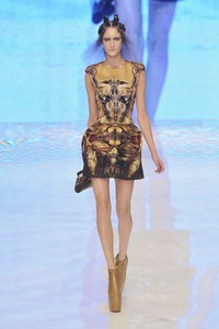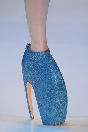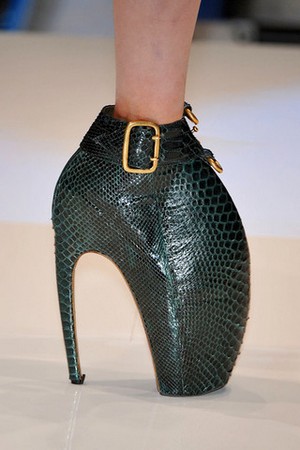 Die grotesken Schuhe sahen auf dem Laufsteg aus, als ob das die Köpfe von ausgestorbenen Meeres Monstern wären. McQueen hat laut der News sein Motto gewählt, was uns die vorhergesagte Ökologische Katastrophe zeigen soll: die Menschenrasse wird gezwungen wieder in die Wasserwelt zurückzukehren, nach dem die Eis Massen tauen....