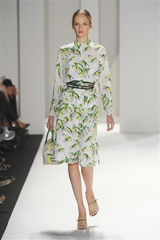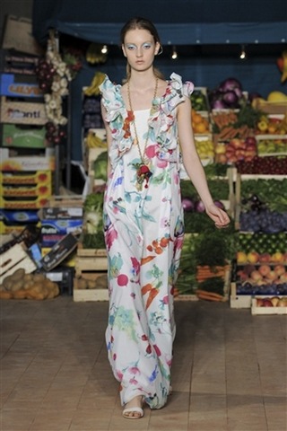 Modisch werden unter anderem Blumen, Vögel und sogar Auto Aufdrücke sein... Prada macht's vor.... Carolina Herrera zeigt sich etwas weiblicher und Moschino.... sein Gemüse.
