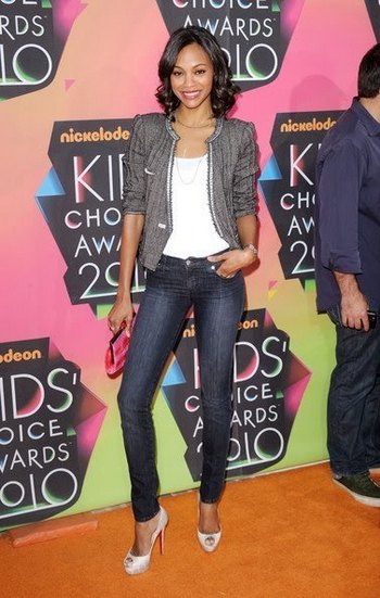 ZSchaut euch das Outfit von Zoe an während der Nickelodeon Kids Choice Awards. Sie hat Röhren Jeans an (Nobody), eine schlichte weiße Bluse und ein graues Jackett (Isabel Marant). Fantastisch sahen die peep-toe Pumps (Christian Louboutin) aus als auch die markante pink Tasche (Ferragamo). Den Charm unterstreicht sie mit feinem Schmuck.