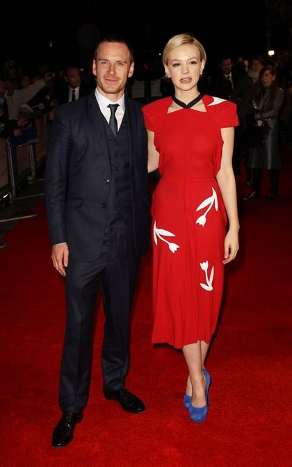 Um weitere Beispiele zu diesem colour blocking Stil zu finden braucht man wirklich nicht lange. Zum Beispiel Carey Mulligan hat blaue Veloursleder Pumps zu einem roten Kleid von Roland Mouret angezogen.