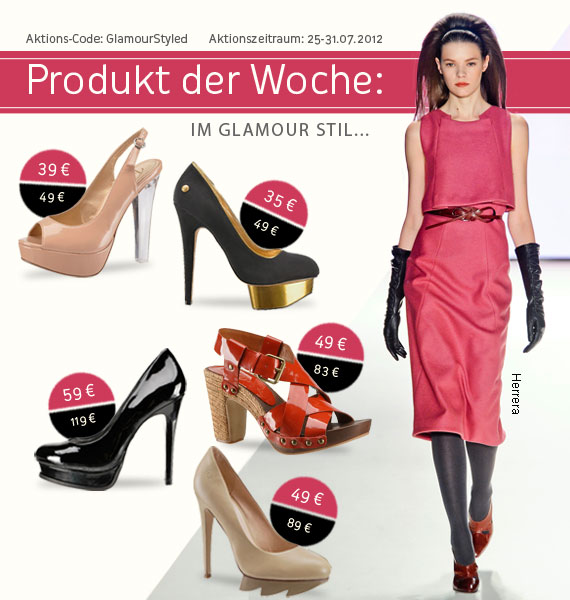 In dieser Woche, von Mittwoch bis Dienstag (25-31 Juli 2012) sind alle unterhalb präsentierten Schuhmodelle im "Glamour" Stil günstiger zu kaufen als unsere diesjährigen Saisonschnäppchen. Es reicht während der Bestellung folgenden Aktions-Code GlamourStyled im Bestellformular anzugeben (zusammengeschrieben) und der Preis wird automatisch herabgesetzt.