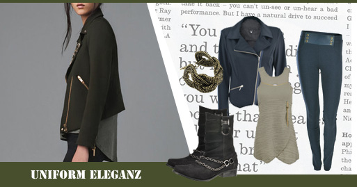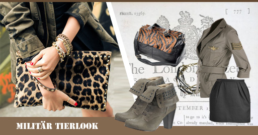 Das zweite Angebot ist ein Look „mit Tiermustern” natürlich auch im Militär Stil, nur etwas innovativer zusammengestellt. Mein persönlicher Favorit in diesem Set ist die typische Militär Jacke mit Schulterklappen. Dazu ein weiblicher Rock und das Set wirkt sexy und weiblich zugleich. Passende Schuhe und eine Tasche der Marke Invuu natürlich in Tiermuster.