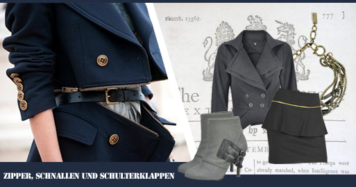 Unser drittes und letztes Angebot ist eine Verbindung aus Zippern und Schnallen in Einem. Ein schwarzer Blazer mit zweier Reihen Verschluss verbunden mit einem Rock und grauen Stiefeletten. Dank diesem Set erhalten wir einen tollen Look und optisch längere Beine.