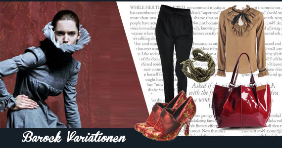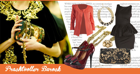 Unser erster Eindruck vom Barock Trend erinnert uns eher an elegante Innenausstattung und vornehme Kleider. Deshalb empfehlen wir Euch für einen eleganten Abend etwas vornehmere Kleidung. Hierzu schlagen wir ein schwarzes, elegantes Kleid, welches die weibliche Taille unterstreicht. Der Ausschnitt ist nicht zu tief, deshalb passt hier ideal eine goldene Kette mit einem größeren Anhänger. Zu diesem eleganten Set dürfen passende Stöckelschuhe nicht fehlen, am besten in rot und die passende Handtasche nicht vergessen!