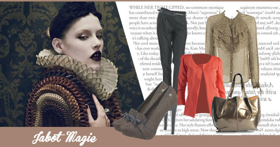 Im Barock Zeitalter war Jabot in Frankreich sehr beliebt. Wir tragen heute keine Hofkleidung, aber wieso sollte man diesen Stil nicht etwas innovativer gestalten? Unser Vorschlag ist, eine schwarze Hose und ein Pullover in orange Farbe. Dazu Stöckelschuhe, die ideal zum ganzen Outfit passen und zuzüglich unsere Beine verlängern.