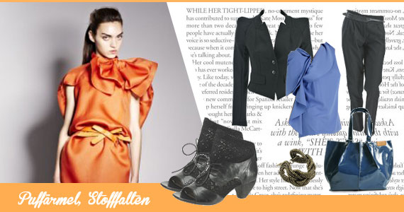 Unser erster Vorschlag ist eine Verbindung aus Puffärmeln und Stofffalten in den Farben schwarz und navy blau. Was sollte man anziehen, damit alles zusammen perfekt passt? Es reicht eine elegante schwarze Hose mit einem blauen Oberteil ohne Ärmel zu verbinden. Damit man nicht allzu friert bei diesem Wetter empfehlen wir einen schwarzen Blazer, der unsere Schultern etwas unterstreicht. Am Ende empfehlen wir Schuhe im barock Stil, die dem ganzen Outfit den Barock Charakter verleihen.