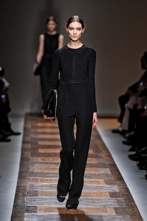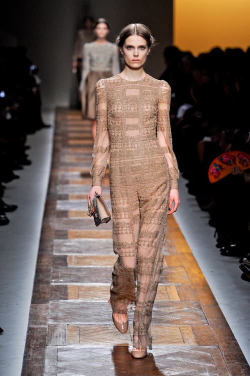 In der neusten Kollektion von Valentino gefallen mir am besten … Hosen. Die langen, weiten Hosenbeine aus zarten Stoffen, sehen wie ein sehr langer, eleganter Rock aus. Ein Jackett und Hose in diesem Stil, werden an dir sehr “Valentino” aussehen.