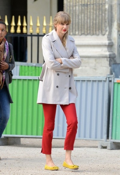 Wie wir bei uns im Shop gemerkt haben, kaufen nur wenige Kundinnen einen bunten oder gemusterten Mantel ein. Am liebsten werden die klassischen Farben sofort ausverkauft, wie beige, schwarz oder grau. Wir verstehen eure Auswahl, denn ein Mantel ist das Hauptelement in einem Outfit für den Winter und muss zu fast allem was wir im Kleiderschrank besitzen passend sein. Aber schaut euch Taylor Swift an - sie trägt einen Mantel in einer neutralen Farbe und und eine Hose in knalliger Farbe, sowie Ballerinas in der Farbe gelb. Etwas untypisch aber passend! Bestimmt besitzt jede von uns etwas aus diesem Set in ihrer Garderobe...