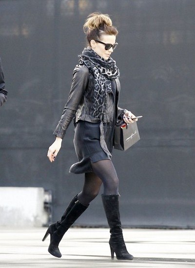 Im Winter kann man sich auch sexy und mit Kralle kleiden. Das müssen nicht unbedingt tiefe Ausschnitte oder Miniröcke sein. Kate hat einen Schal in Tiermuster und eine Lederjacke gewählt. Eine gute Idee...