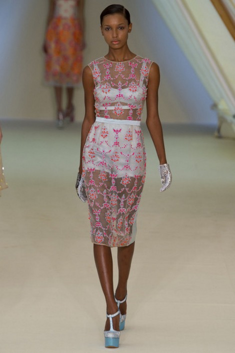 Kristen Stewart hatte ein Outfit aus der Frühlings Kollektion 2013 von Erdem an. Es war ein Top, Shorts und ein durchsichtiges Kleid mit orangen und rosa Akzenten. Dazu trug sie neonfarbene High Heels von Christian Loubouin. Sie hat nicht besonders elegant ausgesehen. Das Original vom Laufsteg sah darin wirklich gut aus.