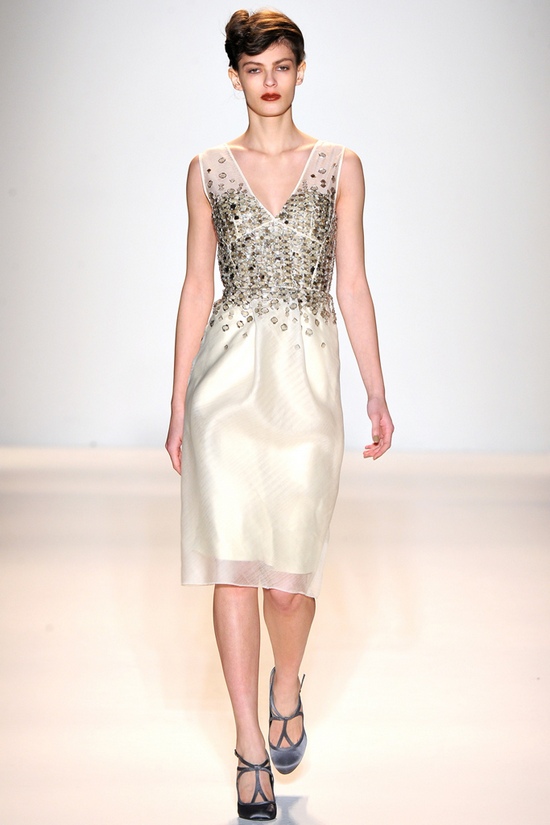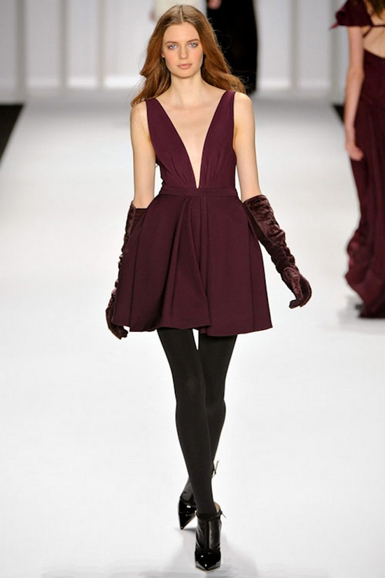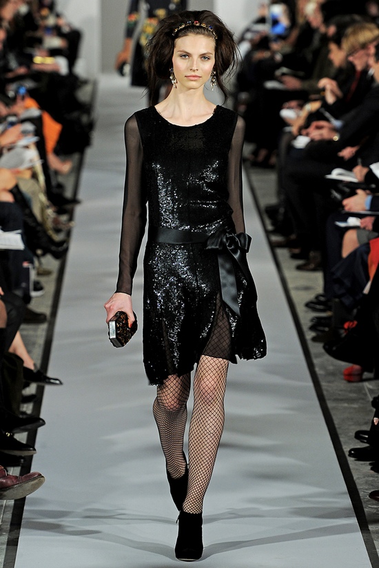 Bei Oscar de la Renta finden wir ein glänzendes Angebot. Das Kleid ist in seiner Form sehr schlicht. Das gewisse etwas verleihen dem Kleid die Netzstrumpfhosen.