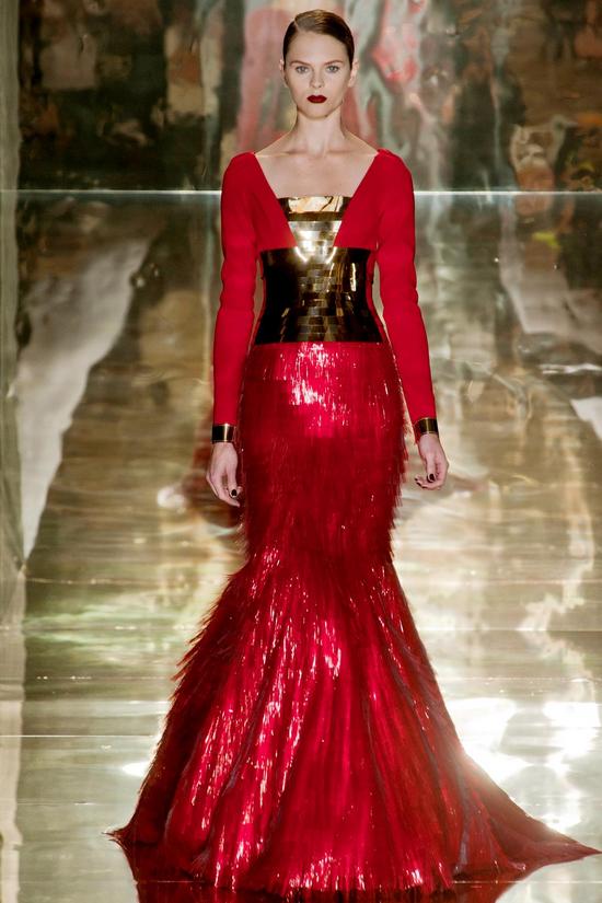 Bei Marchesa bewundern wir den Glanz des Goldes im Barock Stil. Dieses britische Modehaus hat sich von der Fantasie hinreißen lassen und schmückte seine Kreationen mit Federn und Perlen.
