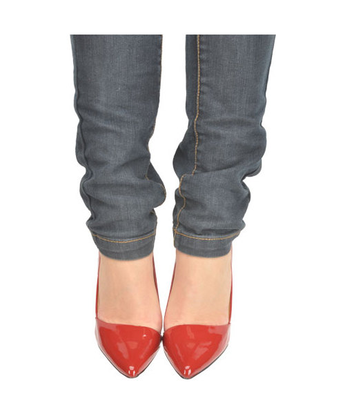Diese Schuhe sind aus echtem Leder in Lack Optik. Sie haben einen 10 cm hohen Absatz. Der Schuhschaft hat eine asymmetrische Form. Hier: