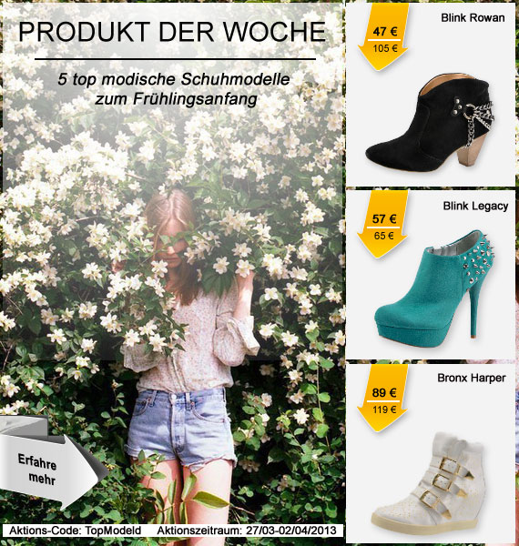 Unter anderem findet man den Klassiker, wie Ballerina Schuhe in vielen, vielen... verschiedenen Frühlingsfarben. Diese sind nicht nur absolut bequem und eignen sich für lange Spaziergänge, sondern sind auch elegant, somit passend zu unserer Arbeit. Nur in dieser Woche habt ihr die Möglichkeit tolle Glam-Rock Stiefeletten bei Butyk.de kaufen, natürlich zu einem absoluten Frühlingsangebot! Aber auch für unsere High Heel Fans haben wir etwas ganz besonderes und zwar unseren Bestseller von BLINK Legancy mit einem verführerischen Stöckelabsatz. Etwas sportlicher zeigt sich hier das High Top Schuhmodell von BRONX. Schaut selbst und sucht euch das passende Modell aus!