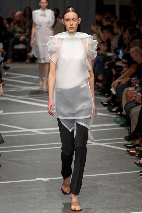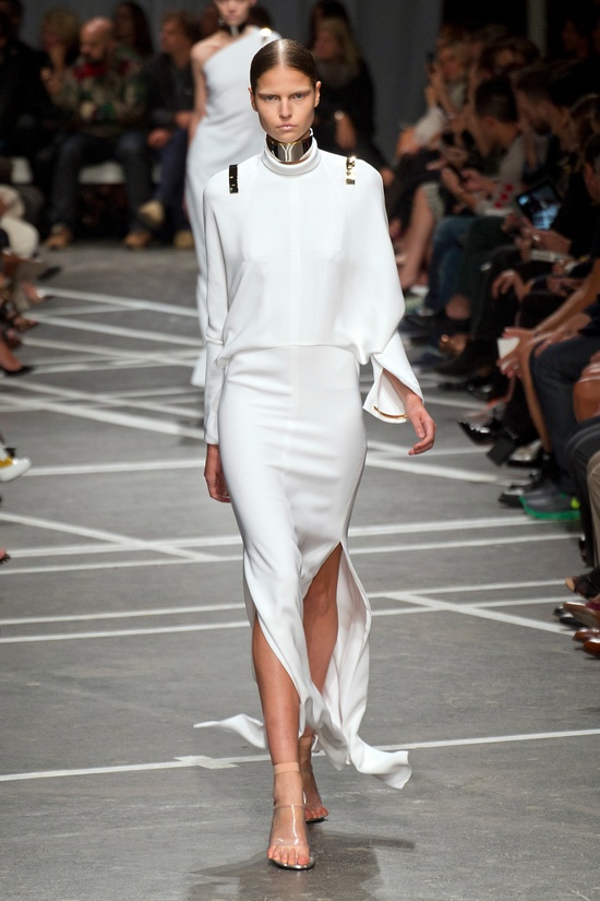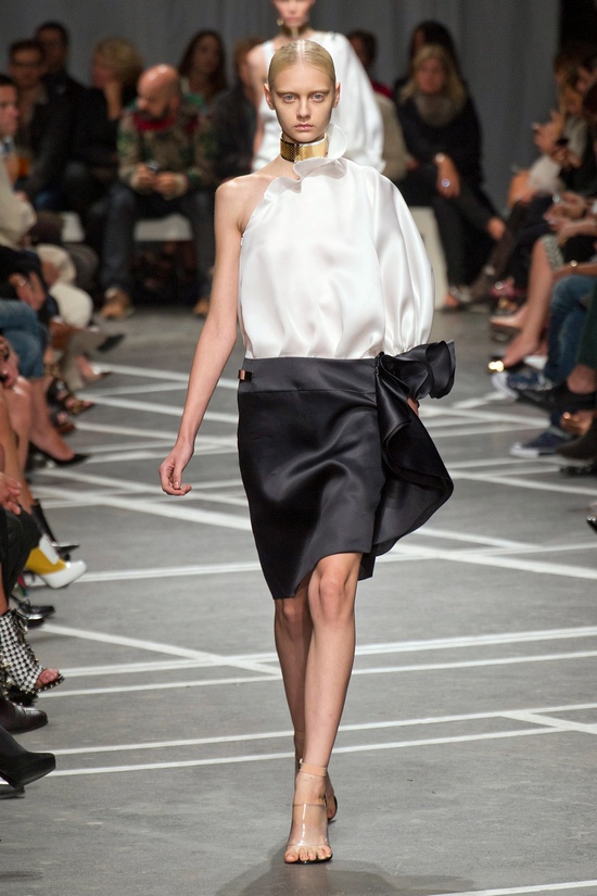 Ist diese Kollektion aber nicht langweilig? Wie soll man schwarz-weiße Outfits tragen, damit sie nicht uninteressant aussehen? Schau, dass die Kreationen von Givenchy nicht langweilig ausfallen. Sie sehen auch nicht einfallslos aus. Damit die Outfits eine interessante Ganzheit bilden, wurden verschieden Materialien und verschiedene Formen angewendet.