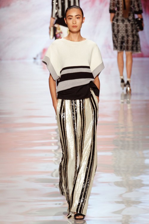In der bunten Kollektion von Dolce & Gabbana sehen wir einen wundervollen Streifenmix. Streifen sind in verschiedenen Richtungen. Sie wurden auch mit bunten Accessoires ergänzt.