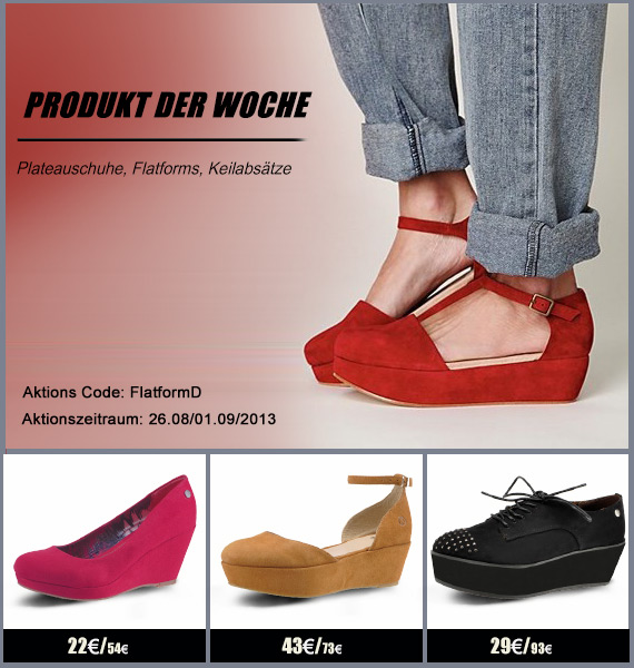 In dieser Woche findet ihr unter anderem rockige Flatforms mit Metallnieten, Keilabsatzschuhe aus Veloursleder in top aktuellen Farben uvm. ...