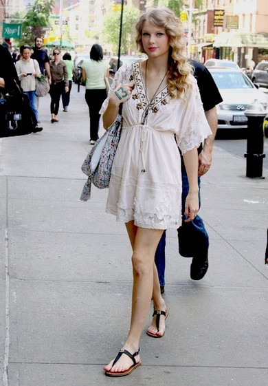 Taylor war auf Shopping Tour und hatte folgendes an: Tunika mit tiefem V-Ausschnitt, modisch gerafft mit Strickbund. Dazu hat sie einfache Leder Sandalen angezogen, welche dank der Farbe die Aufmerksamkeit geweckt haben. Die schwarzen Zehentrenner Sandalen und die beige Tunika wurden von einer langen Halskette mit Perlen unterstrichen.