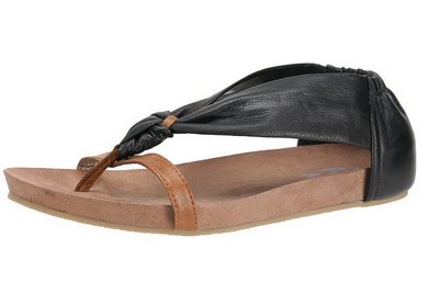 Lenna besitzt eine runde Schuhspitze. Der Oberschuh wird von einem Knoten verziert der Zehentrenner dient. Ansprechend ist das Leder und die Mischung der Farben schwarz und braun, sowie der Gummizug an der Ferse.