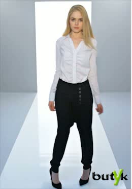 Lässige Hosen im Aladin Stil verbunden mit einem weißen und elegantem Hemd, passt dieses Outfit zur Arbeit? Ja, wenn man bei den sicheren Farben bleibt und elegantes Schuhwerk anzieht, am besten High Heels. Das Hemd unbedingt in der Hose tragen, damit hier wenigstens ein bisschen Dresscode zu sehen ist.