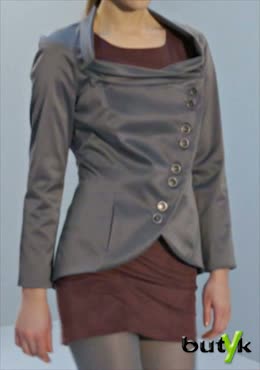 Ein kurzes Kleid in Pflaumen Farbe, harmoniert ideal mit der Farbe grau und wie hier mit einem Satin Jackett. Ein toller Fasson asymmetrisch geschnitten und hinten mit einer kleinen Überraschung... einem Frack. Hoche sexy High Heels machen das Outfit perfekt.
