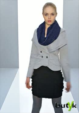 Ein tolles Jackett mit zweier Riehen Knopfverschluss, breitem Kragen und einem fantastischem Halstuch. Dieses etwas rockige Outfit sollte man zu kurzen und flachen Stiefeletten anziehen.